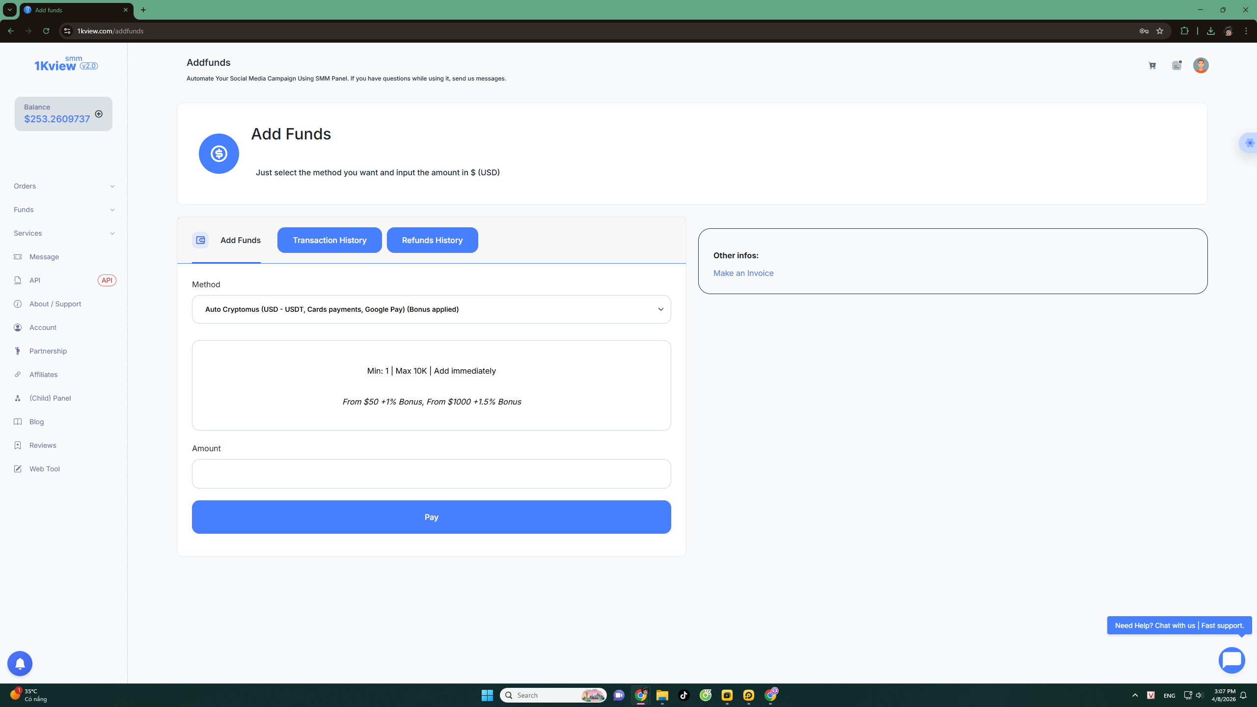 Second, you will deposit funds into your account on 1kview so you can use them to order services. The deposit is secure, and we have many payment methods for you.