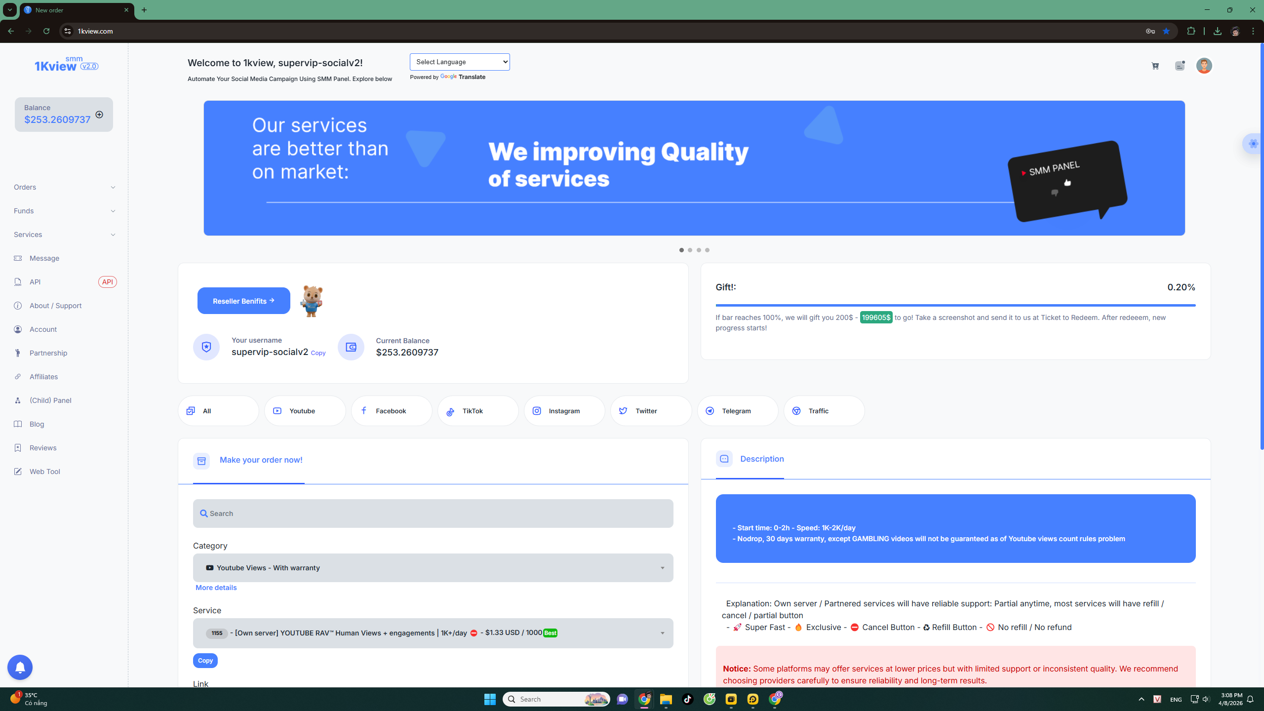 Third, after you have a balance in your account, you can place orders. You need to select the category of service you need, for example, YouTube Subscribers, and choose the service. Fill in the link, quantity, and place the order.